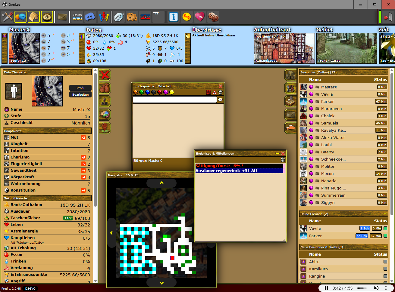 Tauche ein in die Welt von Simkea, wo Abenteuer, Gemeinschaft und Entdeckungen auf Dich warten! Nach dem Untergang des einst mächtigen Reiches Noröm haben wir in dieser friedlichen Parallelwelt eine neue Heimat gefunden. Hoffnungsvolle Flüchtlinge und Magier wählten den Ort Trent, um gemeinsam eine Zukunft aufzubauen und das Unbekannte zu erkunden. Stell Dich den Herausforderungen, entdecke uralte Geheimnisse und werde Teil unserer Geschichte – in einer Welt, die Deine Fantasie beflügelt! Bist Du bereit, das Portal nach Simkea zu durchschreiten?